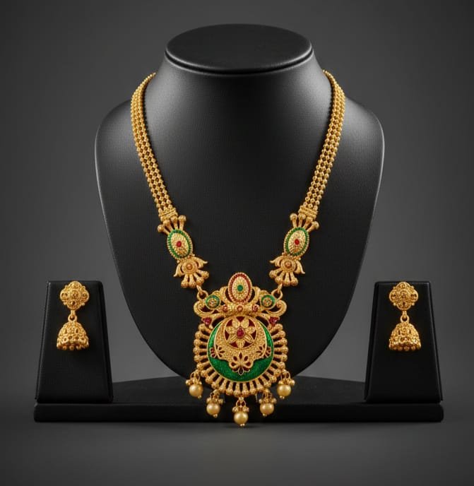A stunning golden heritage long necklace designed with an elegant golden moti mala, paired with a beautifully crafted golden pendant. Inspired by timeless traditional artistry, its rich detailing and royal finish make it a perfect choice for weddings, festive occasions, and ethnic celebrations. This necklace adds classic charm and graceful grandeur to every traditional look